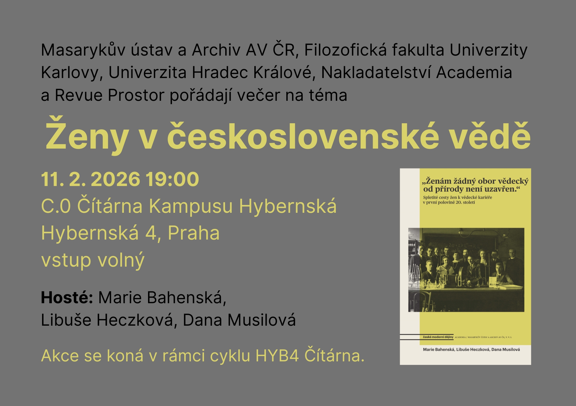 Hosté: Marie Bahenská (MÚA), Libuše Heczková (FF UK) a Dana Musilová (UHK), autorky publikace „Ženám žádný obor vědecký od přírody není uzavřen.“ Spletité cesty žen k vědecké kariéře v první polovině 20. století