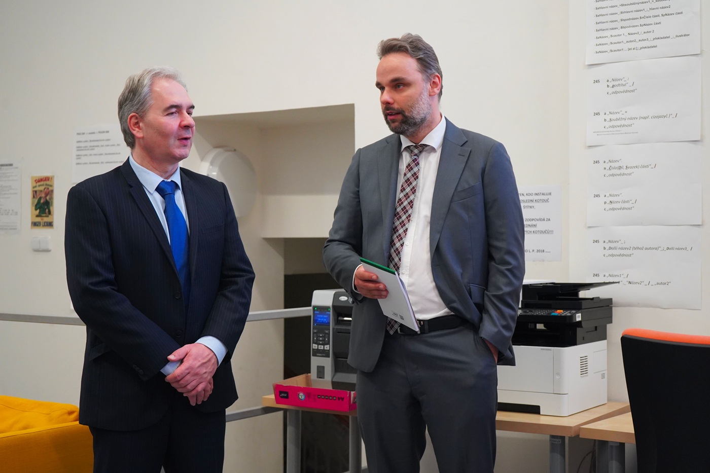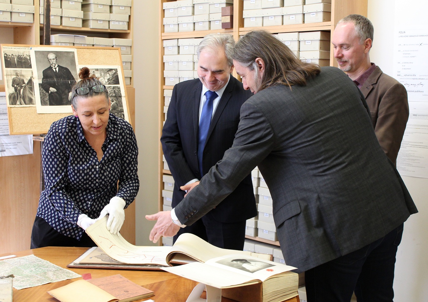 Z knihovních sbírek jsme pro návštěvu vybrali konkrétní ukázky z fondu Knihovny T. G. Masaryka. Hosté si pozorně prostudovali mapu se zakreslenou trasou cesty prezidenta Masaryka ze dne 16. 6. 1929 vztahující se k Boskovicím, odkud Radomír Pánek pochází. Lenka Wágnerová návštěvě dále ukázala například unikátní, ručně vyrobený exemplář publikace Jana Antonína Bati Cesta k hospodářské obnově adresovaný Edvardu Benešovi či několik knih s Masarykovými rukopisnými poznámkami, ať už vědecké (Max Planck), či beletristické povahy (američtí spisovatelé 20. století).